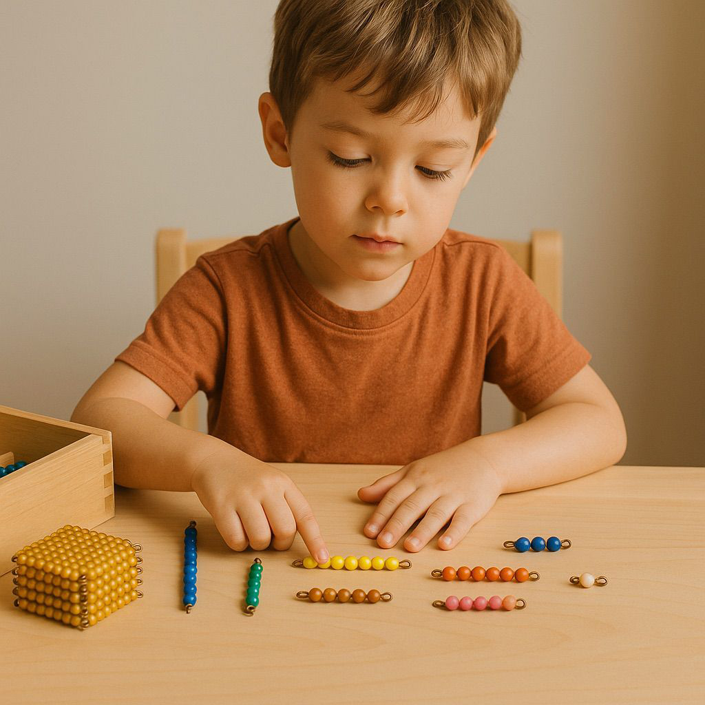Die Montessori-Rechenperlen sind ein anschauliches Lernmaterial, mit dem Kinder Zahlen, Mengen und Rechenoperationen durch Sehen und Anfassen begreifen können.