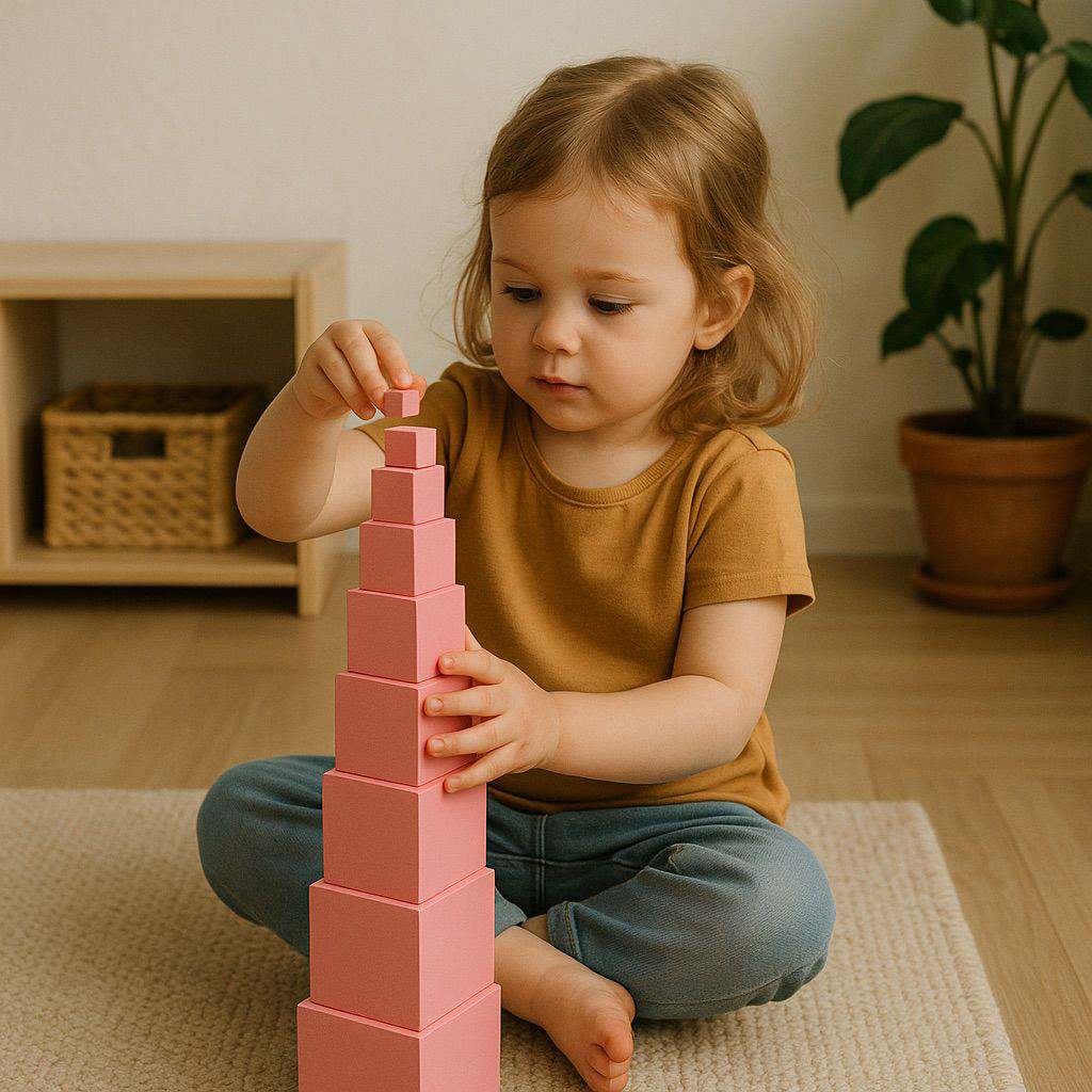 Der Rosa Turm von Montessori ist ein Sinnesmaterial, das Kindern hilft, Größenunterschiede wahrzunehmen und ihre Feinmotorik sowie ihr räumliches Denken zu fördern.